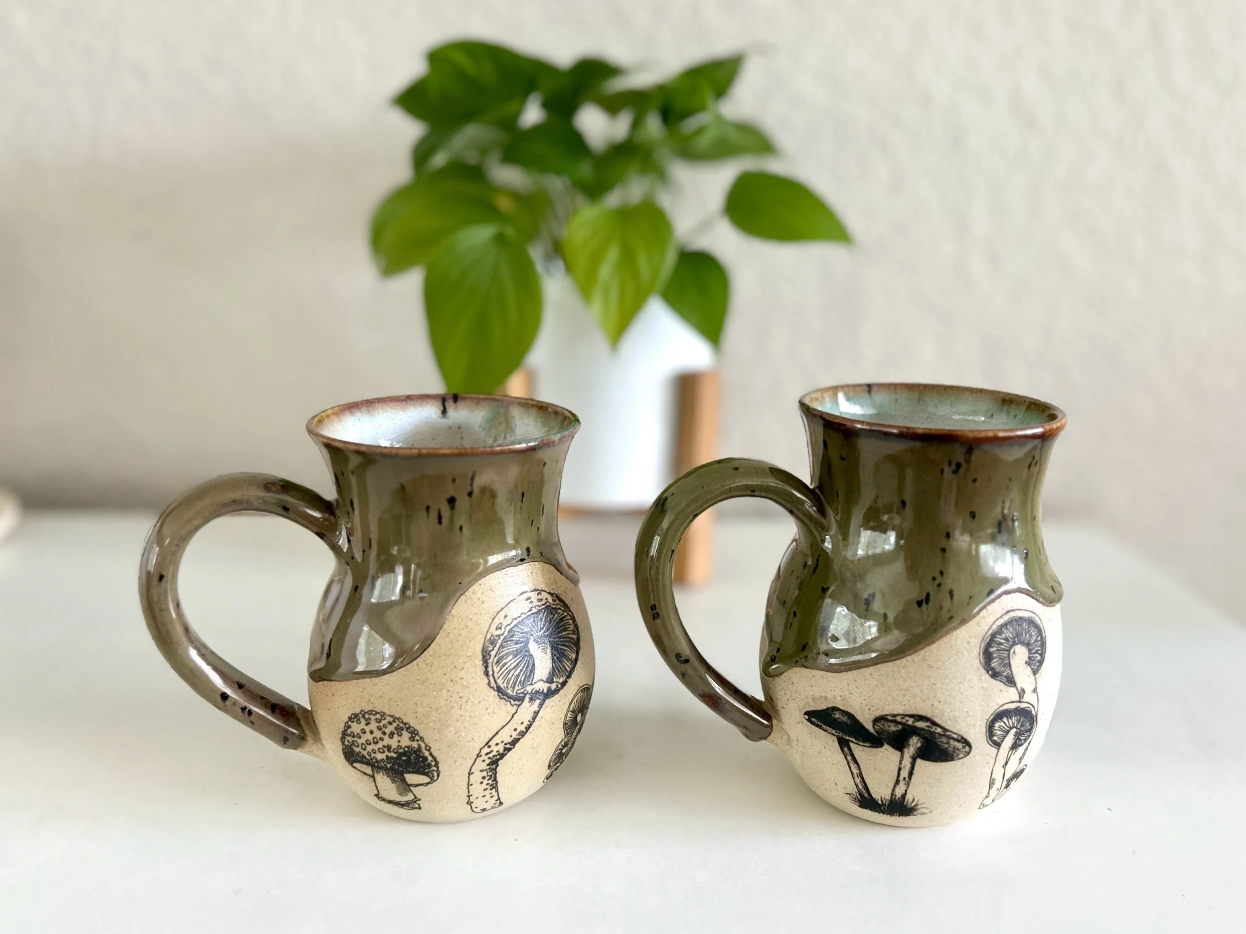 Image 1 of 2 Image 2 of 2 Green Speckled Mushroom Mug $55.00 sold out Hand thrown and glazed ceramic stoneware mushroom mug in speckled green. Dishwasher safe Size: 16oz 19oz Sold Out Added! Hand thrown and glazed ceramic stoneware mushroom mug in speckled green. Dishwasher safe