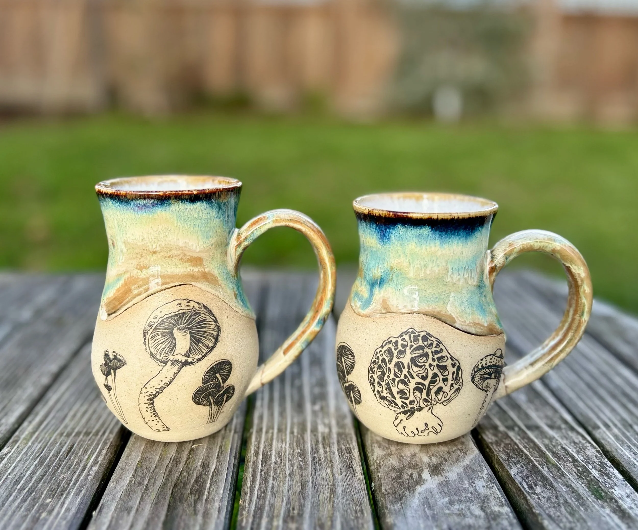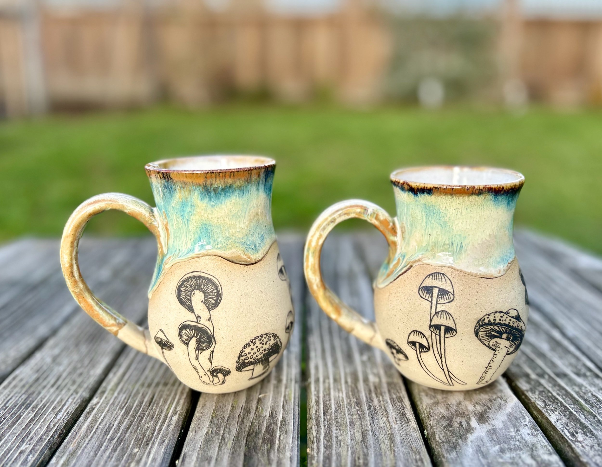 Image 1 of 3 Image 2 of 3 Image 3 of 3 Autumn Blue Mushroom Mug $45.00 sold out Hand thrown and glazed ceramic stoneware mushroom mugs, in my autumn blue glaze. Dishwasher and microwave safe. Size: 16oz 15oz Sold Out Added! Hand thrown and glazed ceramic stoneware mushroom mugs, in my autumn blue glaze. Dishwasher and microwave safe.