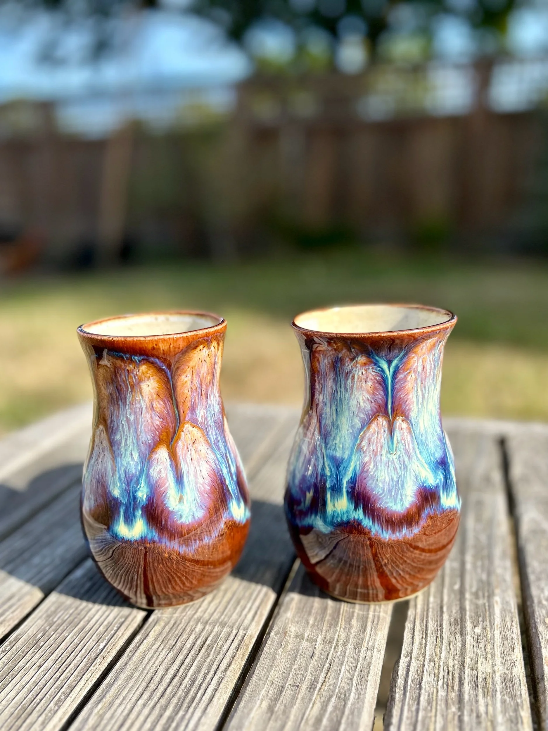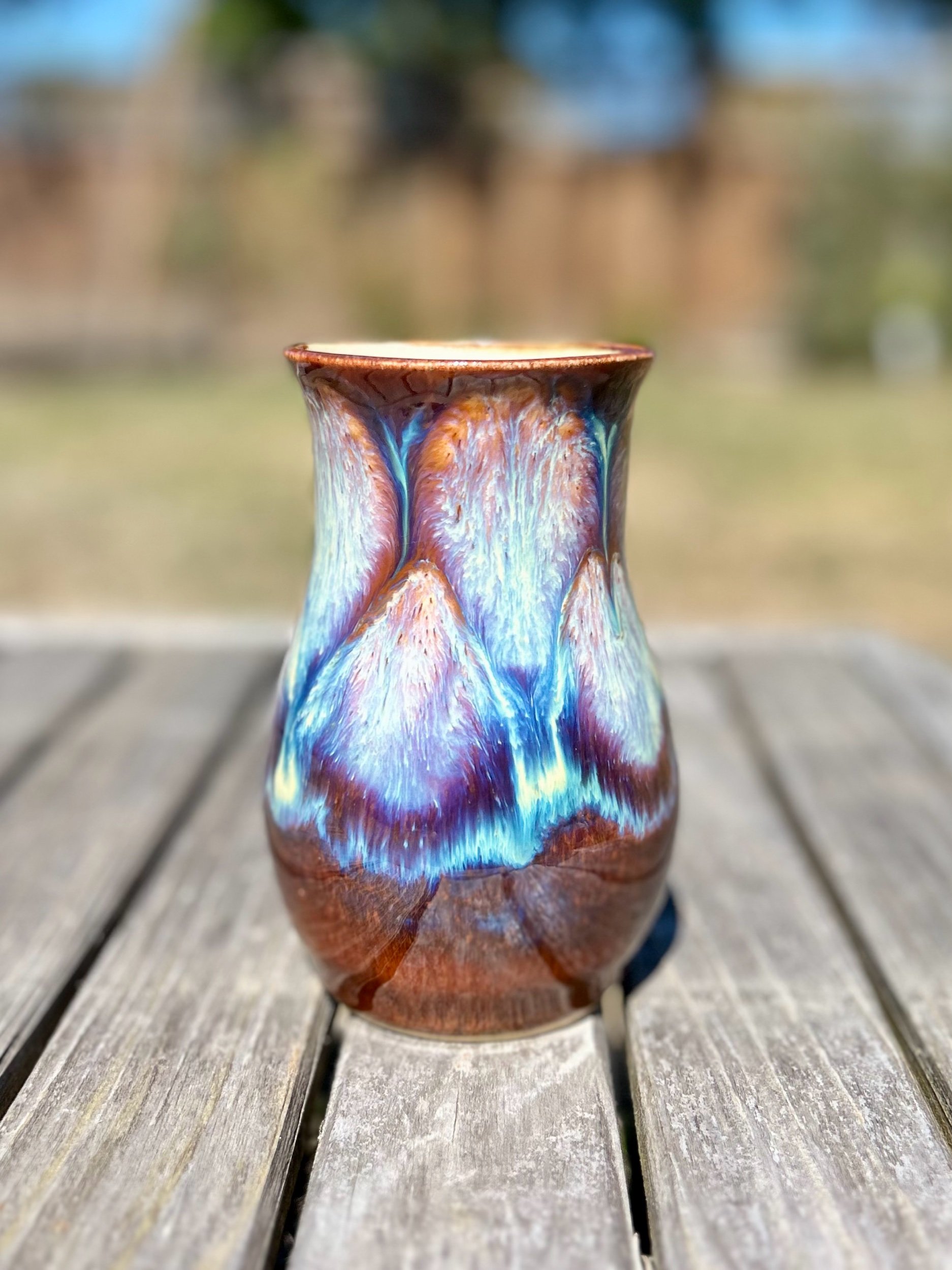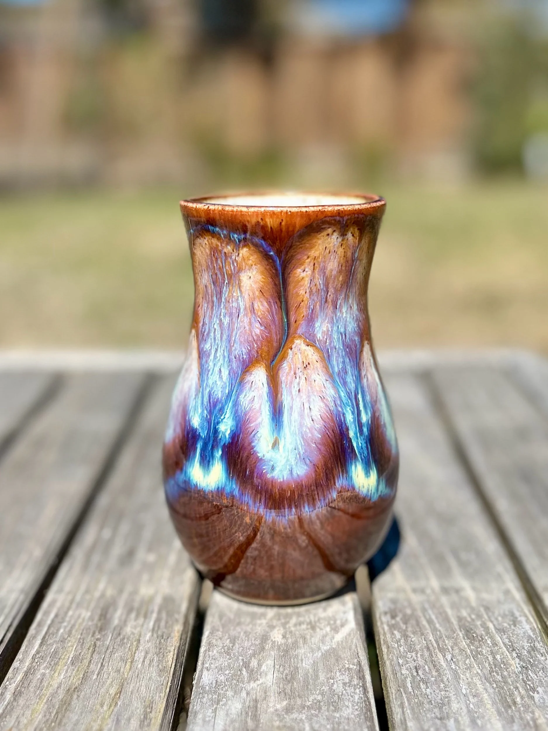 Perfect for autumn, with blues, brown and a hint of purple. Treat yourself to some blooms or pop in your dried lavender. Vase measures 6” tall.